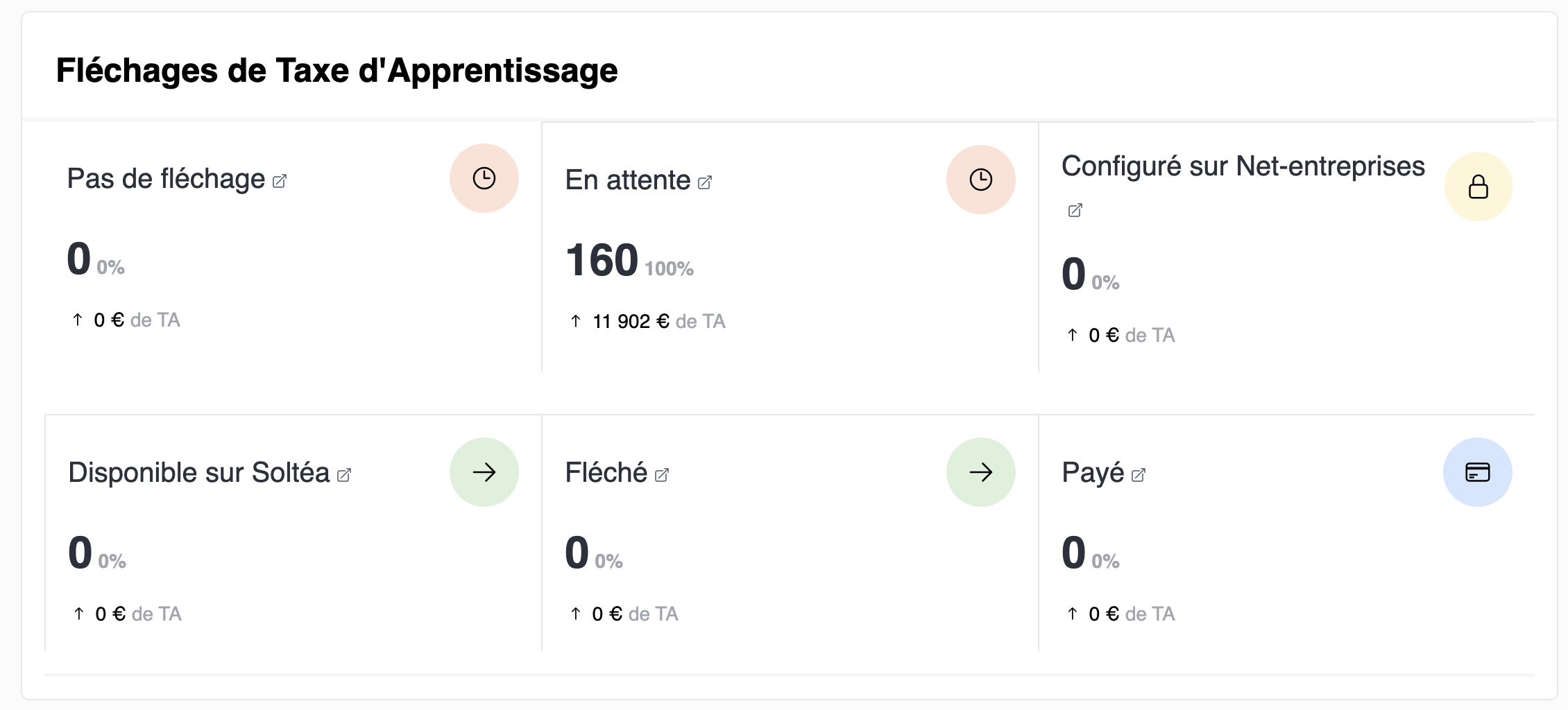 Dans votre tableau de bord, chaque entreprise a un statut de fléchage qui indique où elle en est dans le processus de répartition de la taxe d’apprentissage.