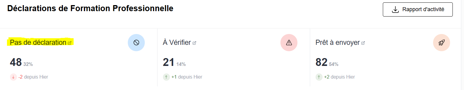 Le statut « Pas de déclaration » dans Kontable correspond à une situation où aucune action supplémentaire n’est requise concernant la DSN importée. Il s’agit d’un processus automatisé qui permet d’archiver les déclarations pour lesquelles aucune cotisation n’est due ni auprès de l'OPCO, ni auprès des organismes paritaires. Si votre DSN est dans ce statut, vous pouvez être assuré qu’aucune action supplémentaire n’est nécessaire de votre part.