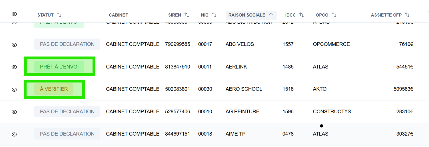 3 - Sélectionner la déclaration correspodante, elle doit être uniquement en statut « à vérifier » ou « prêt à envoyer », car ce sont les seules déclarations pouvant être archivées.