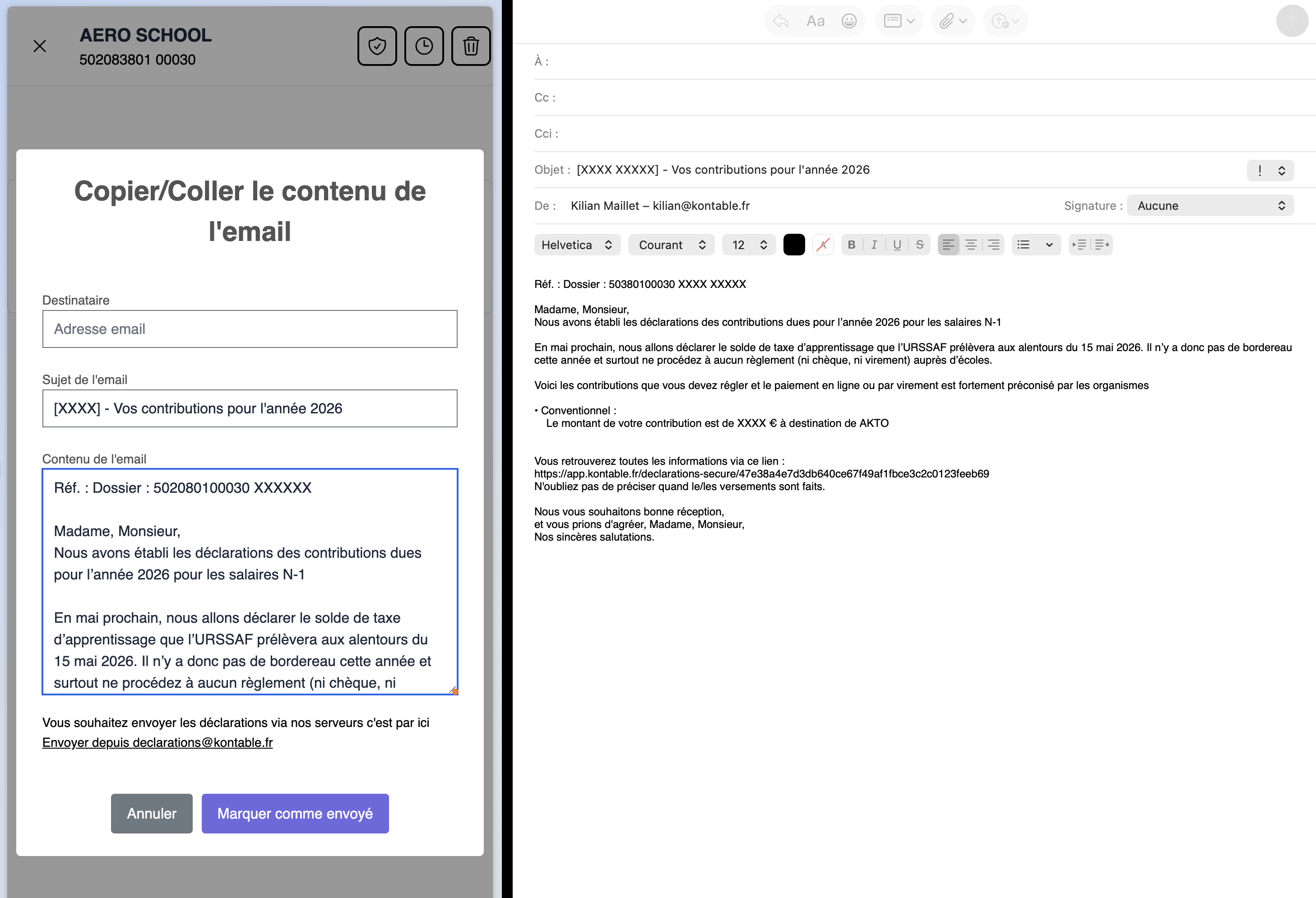 L’email est prêt à envoyer au client avec la demande de paiement de la déclaration depuis votre propre boite email.