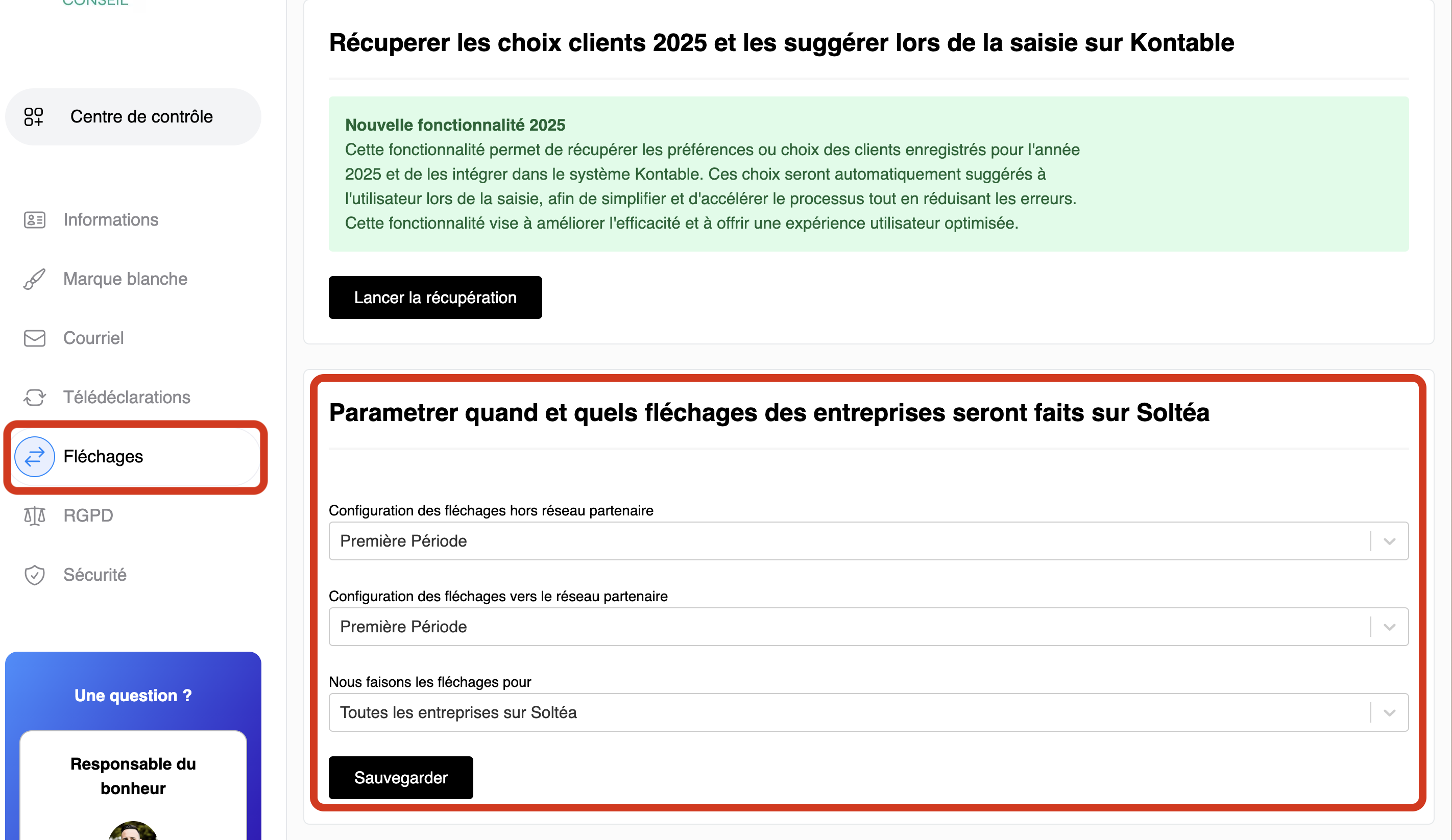 En complément (très utile en 2026) : Tout en haut de la page, cliquez sur le bouton Lancer la récupération → Cela importe automatiquement les choix et préférences réalisés par vos clients en 2025 sur SOLTéA, afin de les proposer par défaut lors de la saisie 2026 sur Kontable.